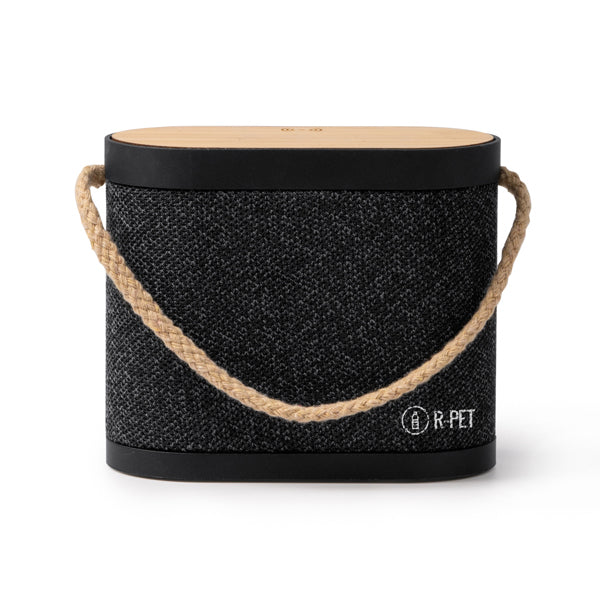 Wireless speaker with bamboo structure and recycled RPET polyester. 5W power output, built-in 15W wireless charger and comfortable cotton carry handle. Type C. Cable included. Presentation in eco design box.